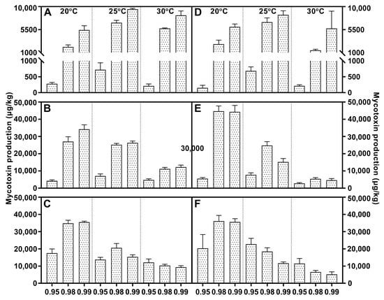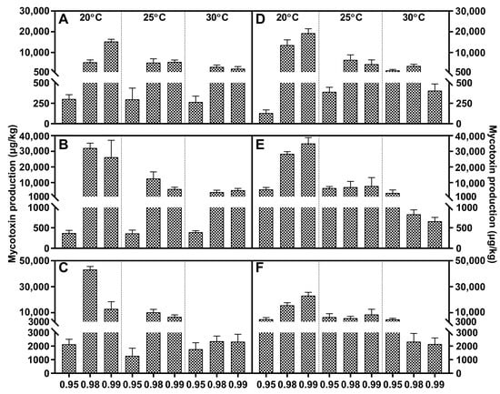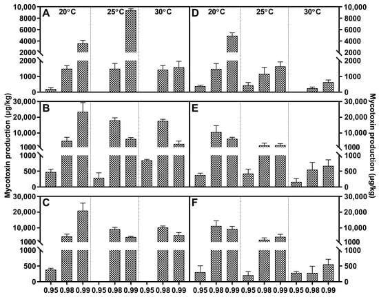 Fusaric acid (grid), fumonisin B1 (black dot) and moniliformin (oblique line) levels produced by Fusarium fujikuroi strain F1 (A–C) and F2 (D–F) growing on PDA adjusted to different water activity, temperature, and incubation time: 7 days (A,D), 14 days (B,E), and 21 days (C,F). Error bars represent the standard error measured between independent replicates.