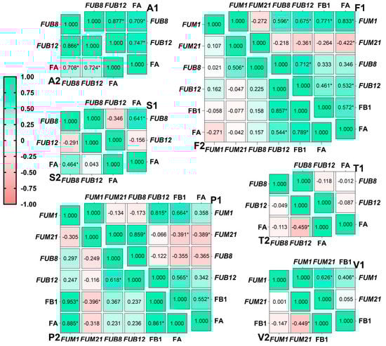 The heatmap of the pairwise Pearson’s correlation between variables of Fusarium strains incubated for 7 days on PDA plate. The strains included Fusarium andiyazi (A1: C19239; A2: C20180), F. fujikuroi (F1: C19232; F2: C20076), F. proliferatum (P1: C19215; P2: C20281), F. subglutinans (S1: C19068; S2: C20215), F. temperatum (T1: C20277; T2: C20278), and F. verticillioides (V1: C19216; V2: C20334). FUM1 and FUM21 coded the polyketide synthase and Zn(II)2Cys6DNA-binding transcription factor in fumonisin synthetic cluster, respectively. FUB8 and FUB12 code the non-ribosmal peptide synthetase-like carboxylic acid reductase and Zn(II)2Cys6DNA-binding transcription factor in the fusaric acid synthetic cluster, respectively. FB1 and FA denote fumonisin B1 and fusaric acid, respectively. * p < 0.05.
