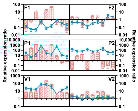 Relative expression of FUM1 (line) and FUM21 (column) of Fusarium fujikuroi (F1: C19232; F2: C20076), F. proliferatum (P1: C19215; P2: C20281), and F. verticillioides (V1: C19216; V2: C20334) strains incubated for 7 days under various conditions. The measured quantity of cDNA was normalized using the Cq values obtained for Act cDNA amplifications. The values represent the expression level of the target gene in the different culture conditions relative to the control culture (25 °C, aW = 1). The data represent the means of three independent repetitions. Error bars represent the standard error measured between independent replicates. The first, middle, and last three points and columns represent the results at 20 °C, 25 °C, and 30 °C, respectively. The columns filled with grids, oblique lines, and squares represent the results under 0.95, 0.98, and 0.99 aw, respectively. Error bars represent the standard error measured between independent replicates.