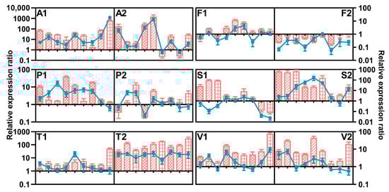 Relative expression of FUB8 (line) and FUB12 (column) of Fusarium andiyazi (A1: C19239; A2: C20180), F. fujikuroi (F1: C19232; F2: C20076), F. proliferatum (P1: C19215; P2: C20281), F. subglutinans (S1: C19068; S2: C20215), F. temperatum (T1: C20277; T2: C20278), and F. verticillioides (V1: C19216; V2: C20334) strains incubated for 7 days under various conditions. The measured quantity of cDNA was normalized using the Cq values obtained for Act cDNA amplifications. The values represent the expression level of the target gene in the different culture conditions relative to the control culture (25 °C, aW = 1). The data represent the means of three independent repetitions. Error bars represent the standard error measured between independent replicates. The first, middle, and last three points and columns represent the result at 20 °C, 25 °C, and 30 °C, respectively. The columns filled with grids, oblique lines, and squares represent the results under 0.95, 0.98, and 0.99 aw, respectively.