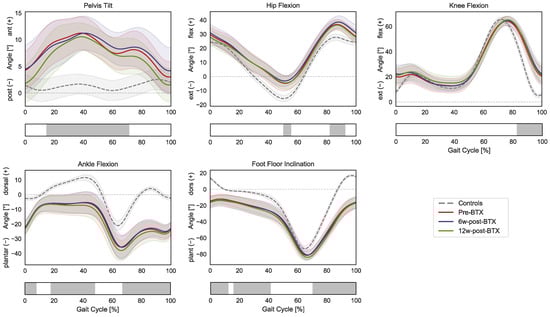 Lower-limb sagittal plane kinematics during the gait cycle (GC). Mean pelvis tilt (+ anterior, − posterior), hip flexion (+ flexion, − extension), knee flexion (+ flexion, − extension), ankle flexion (+ dorsiflexion, − plantarflexion), and foot–floor inclination angles (+ dorsiflexion, − plantarflexion) are reported in red for patients before injection (pre-BTX), in blue at 6 weeks after injection (6w-post-BTX), and in green at 12 weeks after injection (12w-post-BTX). Reference data for the control subjects are reported as dashed grey lines. ±95% confidence intervals are indicated as shaded areas. Periods of GC with a statistically significant difference between controls and patients pre-BTX in the relevant SPM t-tests are indicated as grey bars below each subplot. No significant differences between pre-BTX, 6w-post-BTX, and 12w-post-BTX were found.