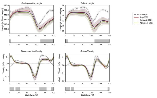 At the same time, the contraction dynamics of the gastrocnemius were characterized by an elongation phase from terminal swing to initial foot contact (instead of shortening, 95–10% GC), an almost isometric phase during loading response (instead of elongation, 13–23% GC), by a reduced elongation during midswing (68–84% GC). The contraction dynamics of the soleus in the patients presented similar differences: 96–9% GC and 12–19% GC). No significant effect of BTX-A on the length and contraction velocity of the triceps surae muscle tendon units was found.
