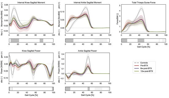 The knee sagittal power only presented limited differences in the transition from swing to stance, while the ankle sagittal power was characterized by an absorption phase during initial contact (0–11% GC) and by a decreased peak generation phase during push off (50–55% GC). Finally, the gait pattern of the patients translated into significantly different required muscle forces by the triceps surae compared to controls with higher forces during early stance (0–13% GC) and a reduced peak force during push-off (37–51% GC). No significant effect of BTX-A on sagittal joint moments, powers, or muscle forces was found.