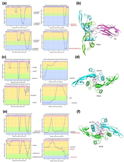 Protein–protein interaction from docking analysis in ClusPro and Peptiderive web tool of different molecules against TGF-β. (a) A plot of interaction regions of positive control VNAR T10 with TGF-β. The red text indicates the sequence of the complementarity-determining region 3 (CDR3) of the variable domains of the new antigen receptor (VNAR). (b) VNAR T10/TGF-β complex, T10 (magenta cartoon), and TGF-β (chain A green cartoon, and chain B cyan cartoon). (c) A plot of the interaction of amino acids of negative control cal14.1a against TGF-β. (d) cal14.1a/TGF-β complex, cal14.1a (magenta cartoon), and TGF-β (chain A green cartoon and chain B cyan cartoon). (e) A plot of interaction regions of chimeric peptide cal_T10 with TGF-β. CDR3 of VNAR T10 in the scaffold is shown in red. (f) cal_T10/TGF-β complex, cal_T10 (magenta cartoon), and TGF-β (chain A green cartoon, and chain B cyan cartoon).