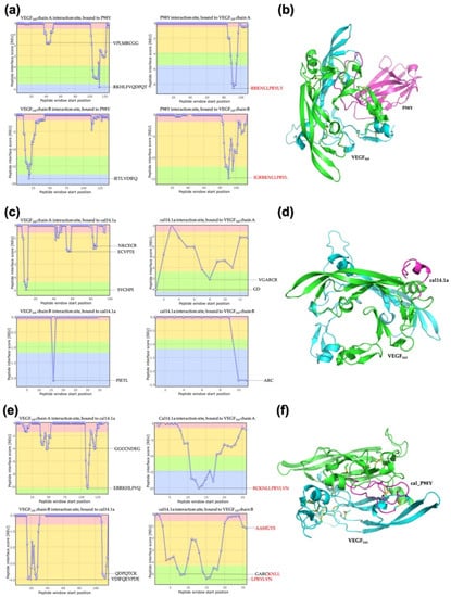 Protein–protein interaction from docking analysis in ClusPro and Peptiderive web tool of different molecules against VEGF165. (a) A plot of interaction regions of the positive control variable domains of new antigen receptor (VNAR) P98Y with VEGF165. In red are sequences of the complementarity-determining region 3 (CDR3) of VNAR. (b) VNAR P98Y/VEGF165 complex, P98Y (magenta cartoon), and VEGF165 (chain A green cartoon, and chain B cyan cartoon). (c) A plot of the regions of interaction of negative control cal14.1a and VEGF165. (d) cal14.1a/VEGF165 complex, cal14.1a (magenta cartoon), and VEGF165 (chain A green cartoon, and chain B cyan cartoon). (e) A plot of the interaction regions of chimeric peptide cal_P98Y with VEGF165. In red, CDR3 of VNAR P98Y added to the scaffold. (f) cal_P98Y/VEGF165 complex, cal_P98Y (magenta cartoon), and VEGF165 (chain A green cartoon, and chain B cyan cartoon).