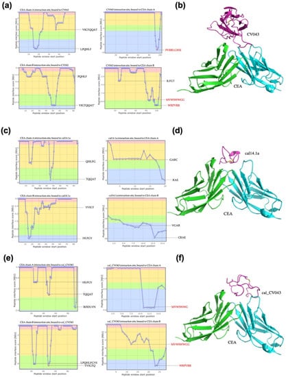 Protein–protein interaction from docking analysis in ClusPro and Peptiderive web tool of different molecules against CEA. (a) A plot of interaction regions of positive control variable domains of new antigen receptor (VNAR) CV043 with CEA, which shows the sequence of CDR3 of VNAR in red. (b) VNAR CV043/CEA complex, CV043 (magenta cartoon), and CEA (chain A green cartoon, and chain B cyan cartoon). (c) Plot of interaction of amino acids of the negative control cal14.1a against CEA. (d) cal14.1a/CEA complex, cal14.1a (magenta cartoon), and CEA (chain A green cartoon and chain B cyan cartoon). (e) A plot of interaction regions of the chimeric peptide cal_CV043 with CEA. The CDR3 of the VNAR CV043 in the scaffold appears in red. (f) cal_CV043/CEA complex, cal_CV043 (magenta cartoon), and CEA (chain A green cartoon and chain B cyan cartoon).