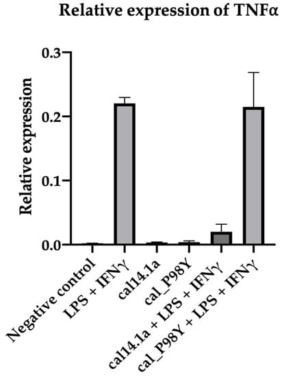 By themselves, neither synthetic peptide favors the expression of TNF-⍺ in cells that are not exposed to pro-inflammatory stimuli (M0). However, in the presence of a pro-inflammatory stimulus, the cal141a peptide significantly decreases TNF-⍺ expression, while cal_P98Y does not modify the expression induced by LPS and IFN-y (Figure 4).