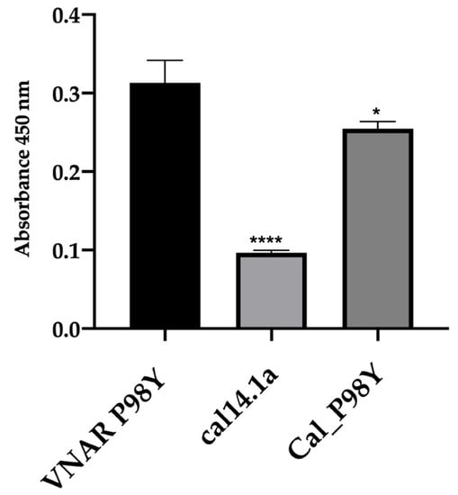 ELISA recognition assay of VEGF165 for cal14.1a (negative control), VNAR V13_P98Y (positive control), and chimeric peptide cal_P98Y. The difference in VEGF165 recognition of the VNAR P98Y compared to the cal14.1a peptide was significant (p ≤ 0.000 (****)). The NoNaBody cal_P98Y obtained a statistical difference of p ≤ 0.1 (*).