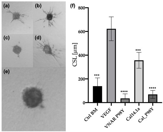 Three-dimensional in vitro angiogenesis assay based on collagen gel-embedded endothelial cell spheroids. Human umbilical vein endothelial cell (HUVEC) spheroids treated with VEGF165, anti-VEGF165 VNAR P98Y, and the chimeric protein cal_P98Y. (a) HUVEC spheroid without treatment (control basal medium (BM), p < 0.01 (***)). (b) Spheroid stimulated with VEGF165 (EC + VEGF165). (c) Positive control, spheroids stimulated with VEGF165 and treated with VNAR P98Y (EC + VEGF165 + VNAR P98Y). (d) Endothelial cell spheroids stimulated with VEGF165 and treated with cal14.1a (EC + VEGF165 + cal14.1a) p < 0.01 (***). (e) Endothelial cell spheroids stimulated with VEGF165 and treated with cal_P98Y (EC + VEGF165 + cal_P98Y). (f) A plot of cumulative sprout lengths (CSL) of capillary-like sprouts measured after 24 h of incubation. Angiogenesis sprouts were significantly (p < 0.001 (****)) inhibited when the spheroids were treated with VNAR P98Y and isolated chimeric protein cal_P98Y.