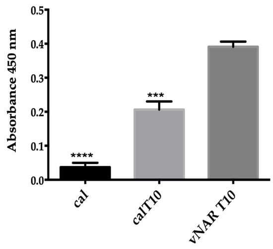 ELISA recognition assay of TGF-β for cal14.1a (negative control), VNAR T10 (positive control), and chimeric peptide cal_T10. The difference in TGF-β recognition of the VNAR T10 compared to the cal141a peptide was significant (p ≤ 0.001 (****)). The NoNaBody cal_T10 obtained a statistical difference of p ≤ 0.01 (***).