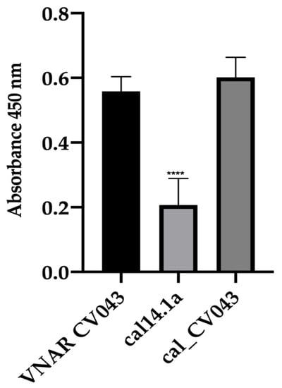 ELISA recognition of CEA for cal14.1a (negative control), VNAR CV043 (positive control), and chimeric peptide cal_CV043. The difference in CEA recognition of the VNAR CV043 compared to the cal141a peptide was significant (p ≤ 0.001 (****)). The NoNaBody cal_CV043 obtained no statistical difference.