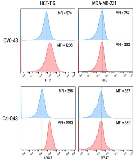 Representative histogram of anti-CEA in two cell lines and the MFI index. Colon cancer cells HCT-116 (CEA+) and breast cancer cells MDA-231 (CEA−) were stained with the anti-CEA antibodies (red plot), VNAR CV043, or the chimeric peptide cal_CV043, and the mean fluorescence intensity (MFI) was evaluated. The dotted line represents the mean of the negative control (blue plot), which were the only cells with secondary antibodies (αHA-FITC or αCal serum + αmouse IgG1-AF647).