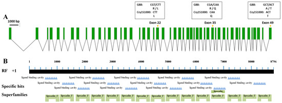 - Tanaka, S.; Endo, H.; Adegawa, S.; Iizuka, A.; Imamura, K.; Kikuta, S.; Sato, R. Bombyx mori ABC transporter C2 structures responsible for the receptor function of Bacillus thuringiensis Cry1Aa toxin. Insect Biochem. Mol. Biol. 2017, 91, 44–54. [Google Scholar] [CrossRef]