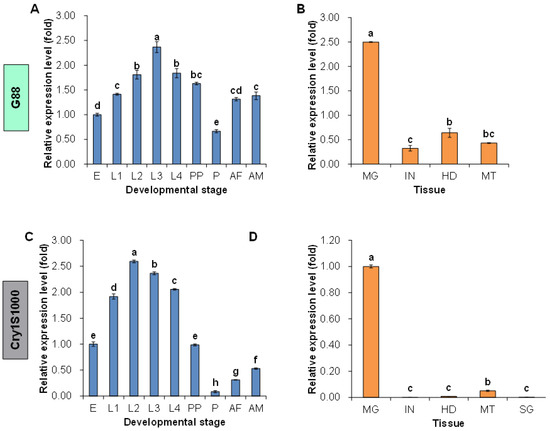 2.3. Spatio-Temporal Expression Patterns of the Pxpolycalin Gene in G88 and Cry1S1000 Strains