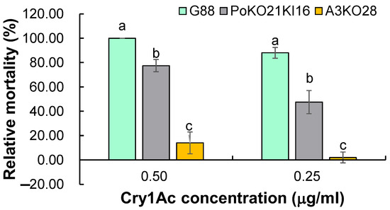 2.7. Effect of Pxpolycalin and PxABCC2 Mutations on the Susceptibility of Cry1Ac Toxin in P. xylostella