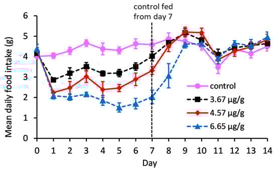Mean daily food intake (g) of mice fed control, low STX (3.67 µg/g), med STX (4.57 µg/g) or high STX (6.65 µg/g) diets for 7 days followed by a further 7 days on control diet. Error bars represent SEMs.