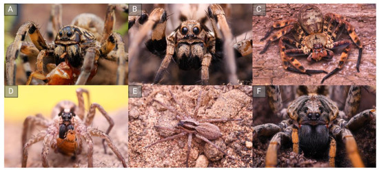 The diversity of RTA-clade spiders, the only spiders known to produce short linear peptides (SLPs) in their venoms. Top row, from left to right: Lycosa hispanica (A), Lycosa praegrandis (B) and Heteropoda lunula (C). Bottom row, from left to right: Hogna graeca proximal (D) plus dorsal (E) views, and Hogna maderiana (F). Image credit: Louis Roth, German Arachnological Society.
