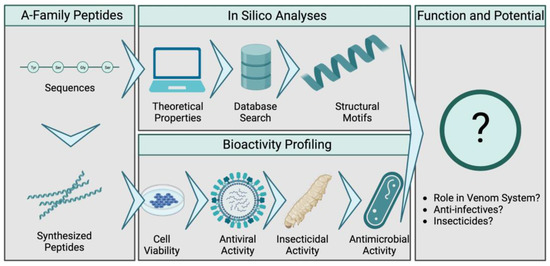 Workflow to determine the bioactivity of L. shansia A-family venom peptides. All known members of the family were synthesized and the physicochemical properties and structures were predicted in silico. Injection into G. mellonella larvae was performed to test for insecticidal activity. Cell viability assays were used to study cytotoxicity against MDCK II cells and protective effects against influenza (H1N1, H3N2 and B-Malaysia). Antibacterial assays were used to characterize antibiotic effects.