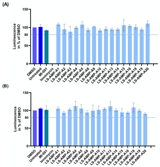 Cytotoxicity was determined as previously described [31]. Peptides and ionomycin (Cayman Chemical, Ann Arbor, MI, USA) were dissolved in DMSO to create 10 mM stock solutions. MDCK II (kidney epithelial cells) and A549 (epithelial lung carcinoma cells) cells were seeded and cultured to 90% confluence in 96-well plates and treated with the compounds (at 100 µM) or DMSO for 48 h at 37 °C in a 5% CO2 atmosphere. Cell viability was determined using CellTiterGlo Luminescent Cell Viability Assay (Promega, Walldorf, Germany). Luminescence was measured in black 96-well plates in a Synergy H4 microplate reader (Biotek, Waldbronn, Germany). Relative light units (RLU) were normalized to the DMSO control set at 100%. Triplicate measurements were used to calculate the means and standard deviations. Raw data are provided in Supplementary File S2.