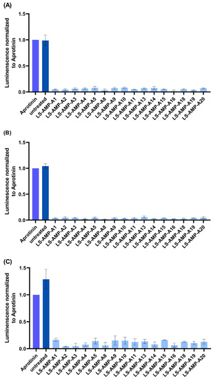 Finally, we assessed the ability of the synthetic A-family peptides to inhibit the growth of bacteria, including several clinically relevant strains (Figure 7). LS-AMP-A1, -A2 and -A3 showed limited activity. LS-AMP-A1 inhibited the growth of Pseudomonas aeruginosa DSM 1117 and Listeria monocytogenes DSM 20600 by ~50% after 48 h, whereas LS-AMP-A2 and -A3 were less effective. In contrast, LS-AMP-A4, -A5, -A8, -A9, -A10 and -A11 inhibited the growth of most of the bacteria except two: the strains P. aeruginosa DSM 1117 and P. aeruginosa DSM 50071. LS-AMP-A5, -A8 and -A10 also showed no activity against Micrococcus luteus DSM 20030. LS-AMP-A13 and -A15 showed limited activity against Staphylococcus aureus DSM 2569 and S. epidermidis DSM 28319, but none of the other bacteria. LS-AMP-A14 showed weak activity against P. aeruginosa DSM 1117 and P. aeruginosa DSM 50071 but was more active against L. monocytogenes DSM 20600. LS-AMP-A16 showed broad activity against all tested bacteria except P. aeruginosa DSM50071. LS-AMP-A18 and LS-AMP-A19 were largely inactive, although the latter strongly suppressed the growth of M. luteus DSM 20030. Finally, LS-AMP-A20 showed marginal effects against several bacteria, but the strongest effect was observed against M. luteus DSM 20030. The raw data for each peptide and bacterium are presented in Supplementary File S5.