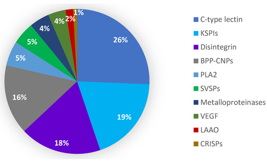 The highly expressed venom transcripts were categorized into 23 toxin gene families, including 53 unique full-length sequences. The most prevalent transcripts were C-type lectins (CTLs) (26%), Kunitz-type protease inhibitors (KSPIs) (19%), disintegrins (18%) and bradykinin potentiating peptide/C-type natriuretic precursors (BPP-CNPs) (16%). The remaining 21% consisted of phospholipase A2 (PLA2), serine proteases, metalloproteinases, vascular endothelial growth factor (VEGF), L-amino acid oxidase (LAAO) and cysteine-rich secretory proteins (CRISPs) (Figure 1).