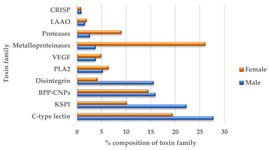 Comparison of toxin transcriptome compositions (the top ten highly expressed toxin families) of male and female snakes.