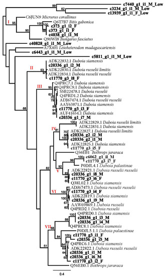 The present study revealed 23 CTL transcripts (4 full-length and 19 partial-length transcripts), including 7 different subtypes of CTLs. They are (I) newly identified Bitis gabonica C-type lectin 1 homolog, (II) D. siamensis p31 β subunit, (III) RVV-X LC1, (IV) D. siamensis p68α subunit and Microvipera lebetina Snaclec A15 homolog, (V) Dabocetin α and Microvipera lebetina Snaclec A12 homolog, (VI) RVV-X LC2 and (VII) D. siamensis p68 β subunits and D. siamensis Snaclec-7 (Supplementary Table S3). Figure 3 shows the gene tree of these sequences. RVV-X CL1 and RVV-X CL2 linked to the metalloproteinase (RVV-X) to act on factor X of the coagulation cascade.