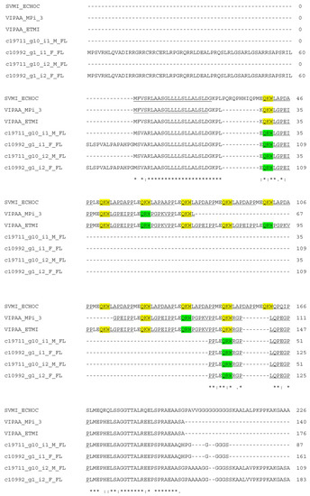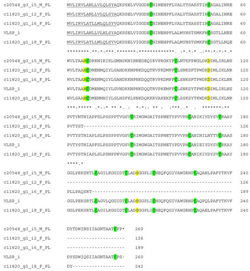 Sequence alignment of VLSP-1 from Macrovipera lebetinus and deduced amino acid sequences of transcripts from the transcriptomes. Signal peptide is single-underlined. Catalytic triad His57, Asp102 and Ser195 are highlighted in yellow. Cysteine residues in six disulfide bridges are highlighted in green. (*) fully conserved residues; (:) strongly similar residues; (.) weakly similar residues.