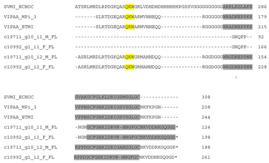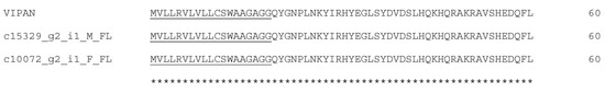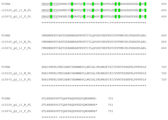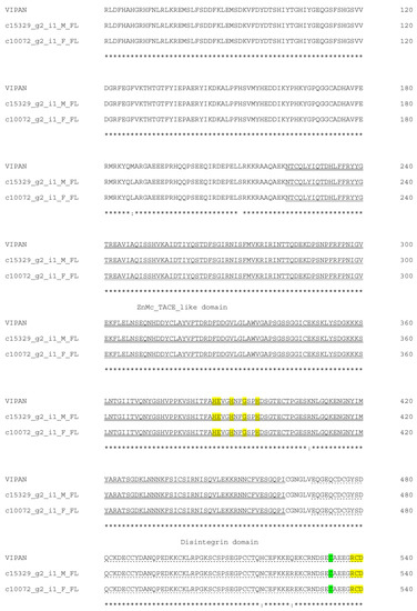 In the current transcriptomes, two full-length transcripts for RVV-X heavy chain (Russell’s viper factor X activator, A0A2H4Z2W1) and two partial-length DSAIP (Daboia siamensis VLAIP-like SVMP, A0A2H4Z2Y9) are the most highly expressed SVMP transcripts (>1.0–1.8 × 104 TPM). Of the remaining three full-length transcripts with TPM values of 15–47, c15329_g2_i1_M_FL and c10072_g2_i1_F_FL were homologous to the A disintegrin and metalloproteinase domain (ADAM)-containing protein 10 from Vipera anatolica senliki (A0A6G5ZVR9) (Figure 9), and c19271_g2_i1_M_FL was homologous to SVMP from Agkistrodon contortrix contortrix (A0A1W7RJN7) (Figure 10). All conceptually translated proteins contained the signal peptide, a metalloproteinase domain containing a Zn+-binding catalytic site and a disintegrin domain. There was an additional ADAM17 MPD domain containing a CxxC motif in the c19271_g2_i1_M_FL transcript.
