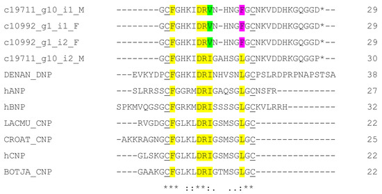The BPP-CNP transcripts usually carry a tripeptide repeat together with bradykinin-potentiating peptides (BPPs) and natriuretic peptide (NP) precursors [28,49]. The two tripeptides (pERW and pEKW) from Myanmar Russell’s viper completely inhibited the gelatinolytic effects of RVV-X and the fibrinogenolytic activities of daborhagin [28]. These viper-restricted inhibitory peptides protected the venom gland from autodigestion and prevented hydrolysis of other proteins in venom glands [50]. Their inhibitory activity towards the SVMP Zn2+ binding site [51] has made them popular targets for drug design in areas of neurodegenerative and cardiovascular diseases. Natriuretic peptides (NPs) in vertebrates promote salt secretion, regulating cardiovascular and renal systems. Three mammalian NPs are atrial natriuretic peptide (ANP), B-type natriuretic peptide (BNP) and C-type natriuretic peptide (CNP). ANP and BNP are released by cardiomyocytes in response to hypertension and hypervolemia, and CNP is produced by endothelial cells. The sequence alignment of various snake venom and human natriuretic peptides is shown in Figure 6, where five residues (F, D, R, I/V and L/F) are crucial for receptor binding [50]. Among MRV CNP transcripts, one had the same conserved amino acid residues, while remaining three possessed V instead of I and F instead of L residues. These variations should be explored in relation to their roles in terms of toxicity and their potential therapeutic properties. NPs have their specific niche in medical research in the treatment of heart failure and hypertension [51,52].