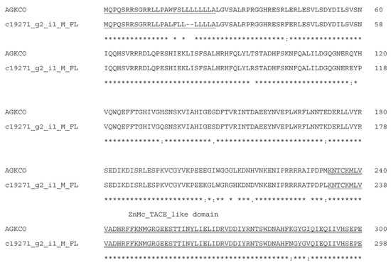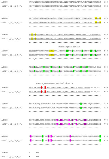 Sequence alignment of AGKCO (snake venom metalloproteinase from Agkistrodon contortrix contortrix, A0A1W7RJN7) and deduced amino acid sequences of c19271_g2_i1_M_FL. Signal peptide is single-underlined. Zinc dependent metalloproteinase domain is double-underlined. The disintegrin domain is dash-underlined. ADAM17-MPD domain is wave-underlined. CxxC motif (membrane-proximal domain) is highlighted in red. PxxP motif is highlighted in pink. Zinc binding site and EECD sequence are highlighted in yellow. Cysteine residues are highlighted in green. (*) fully conserved residues; (:) strongly similar residues; (.) weakly similar residues.