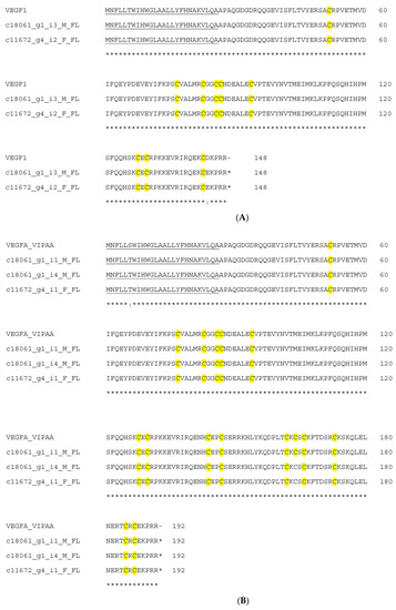 Sequence alignment of deduced amino acid sequences of VEGF transcripts with vascular endothelial growth factor 1 (VEGF1) from Vipera anatolica senliki (QHR82857) (A) and vascular endothelial growth factor A precursor (VEGFA-VIPAA) from Vipera ammodytes ammodytes (C0K3N5) (B). Signal peptide is single-underlined. Cysteine residues are in yellow color. (*) fully conserved residues; (:) strongly similar residues.