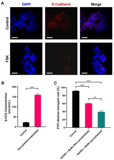 Assessment of the placental barrier model: (A) E-Cadherin expression before and after BeWo cell syncytialization; (B) β-hCG secreted by the placental barrier model; (C) glucose permeability of the placental barrier model. DAPI: blue fluorescence, E-Cadherin: red fluorescence. ** p < 0.01, *** p < 0.001. Scale bar shown is 200 μm.