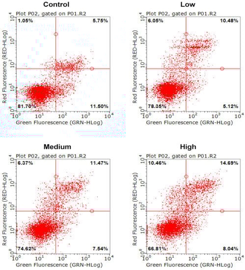 Apoptosis is one of the basic characteristics of cells, and one which plays an important role in embryonic development, tissue repair, internal environment stability, etc. We first assessed the effect of AFB1 on the NSCs cell cycle after passing through the placenta model by annexin V/PI staining (Figure 2). The results of the apoptosis level were divided into four sections, as shown in Figure 2, according to the annexin V/PI staining of the cells. The dots in the lower left part represent live cells, the dots in the lower right are early apoptotic cells, the dots in the upper right are late apoptotic cells, and the dots in the upper left are identified as dead cells. It was observed that with the increase of AFB1 treatment concentration, the proportion of the cell population in the lower left part (live cells) decreased, and the proportion of the other cell populations increased. The statistical results are shown in Table 1. The results showed that, compared to the control group (81.95 ± 1.69%), the live NSCs in AFB1 treatment groups were all significantly reduced (p < 0.05, Table 1). In addition, the number of late apoptotic cells and dead cells was significantly increased in the AFB1-treated groups and showed a dose-dependent effect (p < 0.05). This result suggested that AFB1 could cross the placental barrier model to induce apoptosis of fetal NSCs. It has been shown in human studies that AFB1 has the ability to cross the placental barrier [58,59] and therefore has the potential to impair fetal neurodevelopment. It has been demonstrated that AFB1 could decrease cell viability and induce apoptosis in NSCs, which was consistent with the results of our study [60]. Other neurotoxins, such as homocysteine, were found in another study to cause apoptosis by increasing the level of ROS in NSCs [61]. Therefore, we further examined the intracellular ROS levels.
