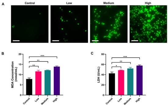 Oxidative damage to NSCs by AFB1 in a dose-dependent manner: (A) ROS level of NSCs exposed to AFB1; (B) MDA content of NSCs after exposure to AFB1; (C) LDH release of NSCs after exposure to AFB1. Low dosage: 0.0641 ± 0.0046 μM AFB1; medium dosage: 5 μM AFB1; high dosage: 10 μM AFB1. * p < 0.05, ** p < 0.01, *** p < 0.001. Scale bar shown is 200 μm.