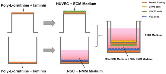 The co-culture process of the three cell types and the schematic diagram of the integrated placental barrier model are shown in Figure 5. The 6-well Transwell plate (140660, Thermo Fisher Scientific, Waltham, MA, USA) was used for this experiment. The polyester Transwell inserts were placed upside-down and the basolateral sides of the membranes were coated with Poly-L-ornithine (0.1 mg/mL) for 2 h at 37 °C. Then the Poly-L-ornithine was then discarded and the basolateral sides of the membranes were coated with laminin (0.002%/1 µg/cm2) overnight at 4 °C. Before inoculation with HUVECs, the 6-well Transwell plate was re-warmed at 37 °C for 1 h. Then the HUVECs were seeded onto the basolateral side of the Transwell insert at 1 × 105 cells/cm2 concentration and incubated at 37 °C overnight to allow attachment. The BeWo cells (1 × 105 cells/cm2) were seeded onto the upper chamber, opposite side of the HUVECs; thus, a two-layer cell “BeWo-HUVECs” placenta model was obtained [57]. The bottom layer of the Transwell plate was coated with poly-L-ornithine and laminin (POL/L, 0.002%/1 µg/cm2) as described previously. The NSCs (1 × 105 cells/cm2) were seeded onto the bottom layer, forming the final composite “BeWo-HUVECs-NSCs” system. A mixture of ECM medium and NMM medium (1:1) was added to the lower lumen of the Transwell to maintain the growth of both HUVEC and NSCs.