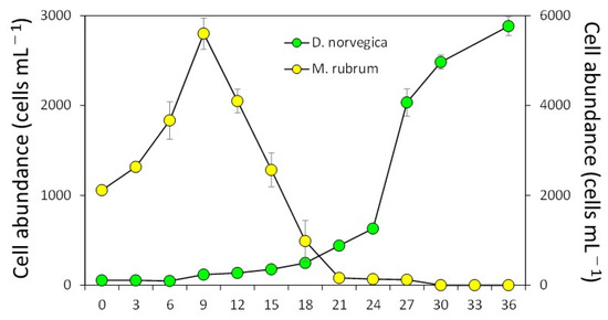 In the growth experiment (12.5 °C, 12:12 light/dark cycle and irradiance of 100 μmol m−2 s−1), the ciliate M. rubrum grew exponentially during the first 9 days, reaching 5600 ± 346 cells per mL−1 (mean ± SD, n = 3) (Figure 3). The information on the experimental conditions is available in Section 4.1. After that, cell abundances of M. rubrum decreased sharply and disappeared by Day 30, probably due to the active consumption by D. norvegica and natural death. Dinophysis norvegica grew, but it showed very slow growth for the first 12 days, suggesting that they have a long lag phase. After that, they grew exponentially, with a maximum growth rate of 0.56 divisions per day−1 (from Day 24 to Day 27), reaching a maximum concentration of 2883 ± 104 cell per mL−1 at the end of incubation (Day 36), and the growth rates in every third day from Day 0 to Day 30 were −0.06 to 0.56 divisions per day−1 (0.18 ± 0.18) (Figure 3).