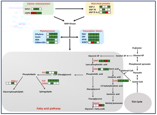 Levels of resistance-associated proteins—including Ca2+ signaling proteins, such as calcium-dependent protein kinase (CDPK) (5.94 FC) and Ca2+ binding protein (SOS3) (2.27 FC)—were not detected or significantly higher in HIGS lines compared to the WT control lines at different time points, except for CDPK that was downregulated at the 0 and 30 h time points. Further, levels of Ca2+ signaling proteins involved in heat shock signal transduction-activated heat shock proteins, such as HSP17.6 (2.50 FC), HSP 2 (2.50 FC), HSP 70 (3.62 FC), and HSP transcription factor A-2 (2.10 FC), were not detected or significantly higher in the HIGS samples compared to the control at most time points.