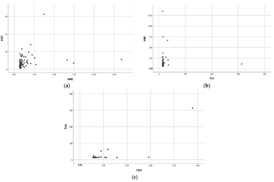 Correlation in concentrations of the four ALTs commercially available Chinese citrus-based products in 2021. (a) AOH vs. AME (r = 0.448, p < 0.01), (b) AME vs. TeA (r = 0.291, p < 0.01), (c) TeA vs. TEN (r = 0.332, p < 0.05).
