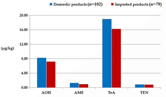 In short, we conclude that the samples from Chinese sources contained higher amounts of ALTs than those from other countries. The distributions of the mean and median concentrations of the four toxins in domestic and imported samples followed the same order, from high to low: TeA > AOH > AME > TEN.