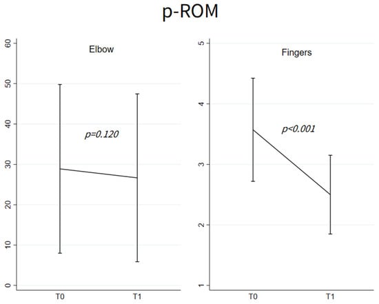 Figure 1 shows elbow p-ROM values at T0 and T1 (left panel) in the 18 patients with decreased p-ROM. These values did not differ between T0 (28.89 ± 20.90) and T1 (26.67 ± 20.79), p = 0.20.