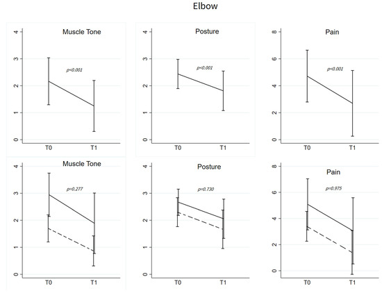 In all injected patients (n = 48), muscle tone and elbow posture scores decreased at T1 (MAS: 2.17 ± 0.87 vs. 1.31 ± 1.01, p < 0.001; posture: 2.44 ± 0.54 vs. 1.80 ± 0.74, p = 0.001). Among patients showing pain at T0 (n = 23), pain decreased at T1 (4.72 ± 1.92 vs. 2.70 ± 2.44, p < 0.001) (Figure 2, top panels).