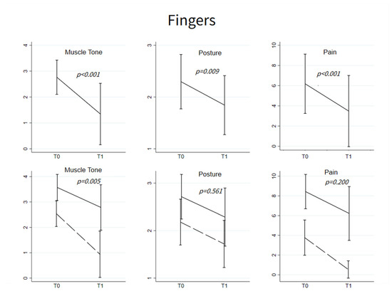 Figure 1 shows finger p-ROM scores at T0 and T1 (right panel) in the 14 patients with decreased p-ROM. The scores decreased at T1 (3.57 ± 0.85 vs. 2.50 ± 0.65) (p < 0.001).