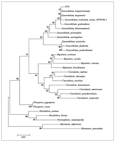 Phylogenetic tree built by the neighbor-joining method using the Jukes and Cantor models for the ITS1-5,8S-ITS2 sequence of the endophytic strain FV3 used to produce the compound monocerin. The GenBank accession of the sequences used in this analysis is presented in Supplementary Material (Table S1).