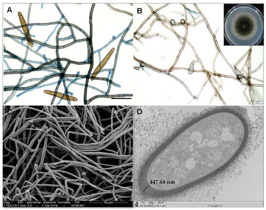 Morphological features of the fungus E. rostratum obtained through optical microscopy ((A,B), bars of 50 and 20 µm), including an inset of the fungus colony picture (B), scanning electron microscopy ((C), 1720×, bar = 50 µm), and transmission electron microscopy ((D), 4646×, bar = 2 µm). Indication of the thickness wall, containing melanin, measured using TEM as 447.64 nm (Leo 906 E Zeiss microscopy serial # 9682, Kv maximum of 120 Kv).