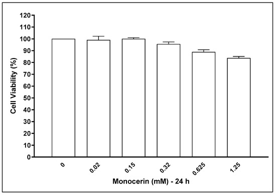 HUVECs (1 × 105 cells/well) in a 96-well flat-bottom microplate were treated with monocerin from 0.02 to 1.25 mM in six replicates for 24 h, and the cytotoxicity was evaluated with the MTT assay [54]. Assays were performed at three different times, and the cell viability was expressed by the percentage of viable cells compared to untreated cells, used as control.
