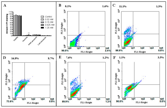 (A) Percentage of viable cells, in necrosis, and in initial and late apoptosis (mean ± SE). Histogram of double annexin/PI staining of untreated (control) endothelial cells (B) and following the treatment with monocerin at (C) 0.02, (D) 0.15, (E) 0.625, and (F) 1.25 mM. Quadrants: left lower = viable cells; right lower = apoptotic cells (annexin V+); upper right = late apoptotic cells (annexin V+ and PI+); upper left = necrotic cells (PI+). Cell distribution in viable, apoptotic (annexin V+), late apoptotic (annexin V+ and PI+), and necrotic cells (PI+). (*** p < 0.001).