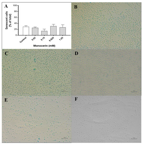 (A) Percentage of senescence of endothelial cells treated with monocerin (Mean ± SE), as well as photomicrograph representatives of senescence processes for (B) untreated (control) cells and those treated with monocerin at (C) 0.02, (D) 0.15, (E) 0.625, and (F) 1.25 mM for 24 h. Cells in blue are senescent, and the brilliant colorless ones are non-senescent cells detected on the β-galactosidase assay. Bars = 100 µm.
