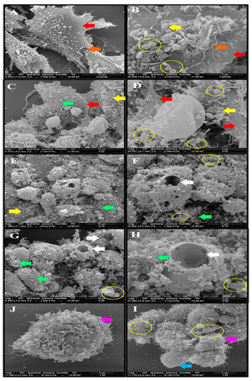 Photomicrograph obtained through scanning electron microscopy of untreated (control) endothelial cells (A,B) (10 μm/9603× and 3 μm/30,024×), and under exposure to monocerin for 24 h at (C,D) 0.02 (10 μm/9578× and 4 μm/24,557×), (E,F) 0.15 (10 μm/7398× and 5 μm/16,992×), (G,H) 0.625 (10 μm/8409× and 3 μm/27,904×), and (I,J) 1.25 mM (5 μm/11,178× and 5 μm/11,028×). Control cells were adherent, willing to constitute a monolayer with the presence of extracellular matrix formation (red arrows), cytoplasmic prolongations, and adhesion to the surface (yellow arrows). Cell junction elements and microvillus are present (orange arrow). Granules of different sizes and forms are adhered and distributed around the cellular body surface for the control and the monocerin group (green arrow). HUVECs treated with monocerin showed retractions of their cytoplasms and inter-cell communication due to the induction of cell division (yellow circle). For monocerin at 0.625 mM, there is an apoptotic body in degeneration, showing holes with corrosive aspect (white arrow). For the higher concentration of 1.25 mM of monocerin, the cell adhesion was lost (blue arrow), and a loss of the microvillus can be observed. There is formation of cellular aggregates, apoptotic bodies (pink arrows), and bubbles around the membrane surface.