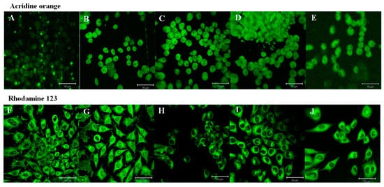AO is a membrane permeable dye that can stain viable and damaged cells, allowing the detection of apoptotic cell death through morphological changes, namely, necrotic and apoptotic stages, mainly in the early and late phases. Viable cells typically exhibit fewer accessible electronegative charges present on proteins. Apoptotic cells, on the other hand, are bright and condensed, with fragmented nucleic acid and intact cell membrane [44].
